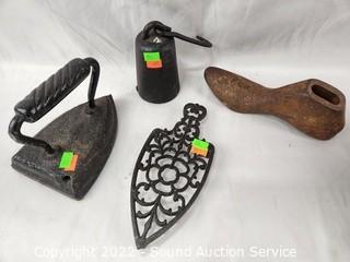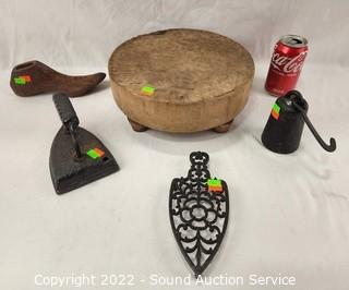 Lot #0278: Cutting Block, Sad Iron, Trivet, Shoe Iron, Weight