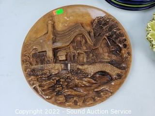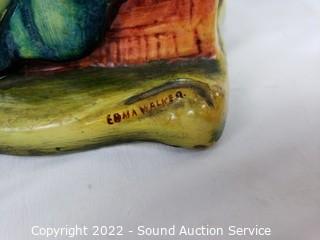 Lot Details: 15" x 7" roaster, 9" plates, Old chalk? or ceramic figure signed Emma Walker, Italian cup, chalk cottage plate 11" dia., hedgehog cloth.