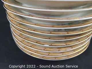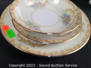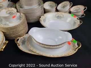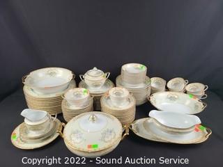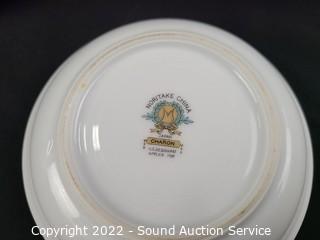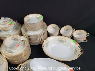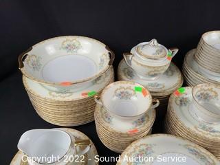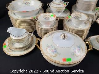 Lot Details: Made in Japan. 9 cups, 12 saucers, 11 berry bowls, 12 snack plates, 12 soup bowls, 12 lunch plates, 12 dinner bowls, gravy bowl, cream, sugar, 9" oval serving bowl, 10" platter, 9" round serving bowl, 9" covered serving bowl. 6 pieces have chips.