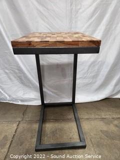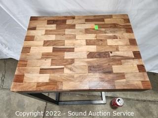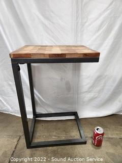 Lot Details: Metal base, appears to be solid wood top, in great condition. 25" x 12" x 16".