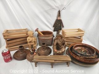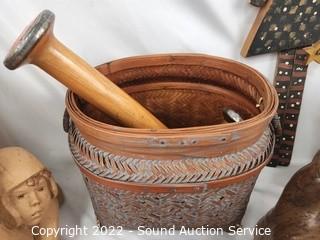 423 Lots including; Antique Ornate Carved Wood Long Ship Sculpture, Vtg./Antique Original & Print Artwork, Red Wing 6-Gallon Crock w/Lid, Nice Pine Dresser, Primitive/Native Carved Masks/Figures, 51pc Towle Sterling "Old Lace" Silverware Set, 4 Vintage Atlas Sound C-120 Tower Speakers, Various Lamps, Asian Inspired Black Lacquer Tiger Scene Table, Unique Popsicle Stick Handcrafted Table Lamp, Equipment Amplifiers, Lg. Amethyst Glass Vase, Danish Mid-Century Modern Stackable Chairs, Schou Andersen Danish Teak MCM Accent Chair, Acoustic Guitars, Vtg. Handcrafted Quilts, Vtg. Record Albums, Smith & Wesson Throwing Knife & Axe Set, Vtg. Sound Equipment, 10k Rose Gold Ring S:5.5, Various Vintage China, Sterling Ornaments, Vtg. Military Ephemera/Collectibles, 18th Century Burl Wood Snuff Box & So Much More!!!