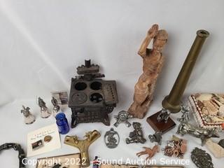 Lot Details: Queen cast iron stove, shell encased trinket box, brass figures, brass nozzle, carved wood figure & much more. Refer to photos for lot contents.