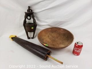 281 Lots including; Husky 2pc Black Steel Locking Tool Chest, West Elm Axel Full Leather Futon, Hisense Household Chest Freezer, Modern Desks, Metal Base Wood Entryway Bench, Entryway Benches, Hand Carved Didgeridoo, Native Copper Jewelry, Vintage Player Piano Rolls, Vtg. Pottery China, Le Creuset & Other cast Iron Enamelware Cookware, Whiskey Crocks, Blue Danube Japan Fine China, Vtg. Records, Asian Collectibles/Decor, Children's Toys, Artwork, Vtg. Glassware, Sports Trading Cards, Air Conditioners, African Juju Hat/Headdress, Various Knick Knacks, Collectibles So Much More!!!