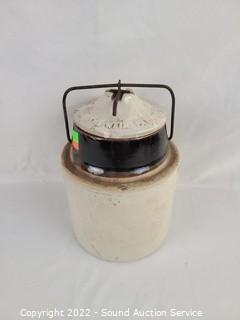 Lot Details: One insulator has a large chip. Crock has a patent date 1801. 9" H x 8.5" Dia can.