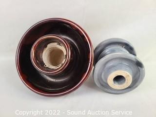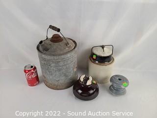 Lot #0127: Ceramic Insulators, Crock & Galvanized Can
