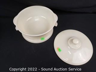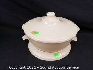 Lot Details: 8.5" dia covered server with burner warming under plate. Pink compote is not marked, 5.5" H x 6" dia.