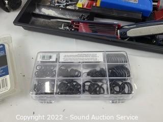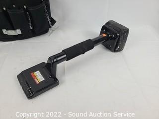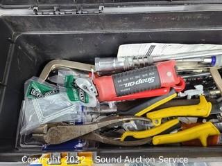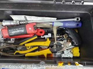 Lot Details: Carpet knee kick, CLC nylon carpenters tool bags, socket set, tin snips, hacksaw, screws, hex key wrenches, 17.5" toolbox.