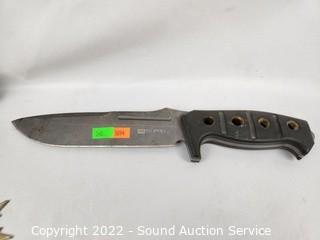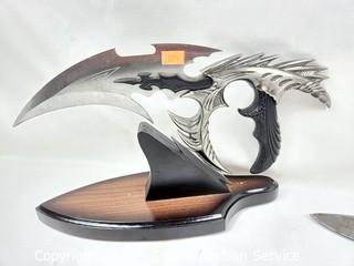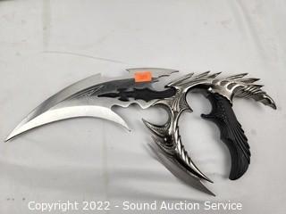 Lot Details: Tactical knife is Milspec fixed blade 12" long (some glue residue on the tip), 12.5" curved fantasy dagger w/display, 3.25" throwing star, not sharpened.