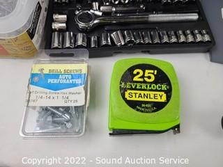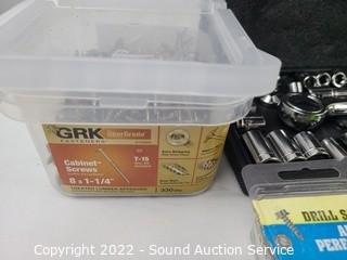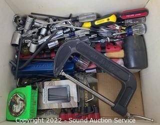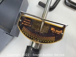 Lot Details: Wilmar torque wrench, various sockets, screws, drill brushes, drill index, screwdrivers, rubber mallet, 6" "C" clamp, tape measures & more.