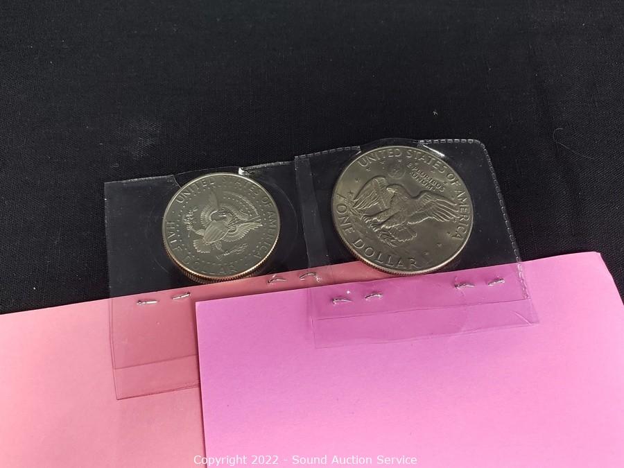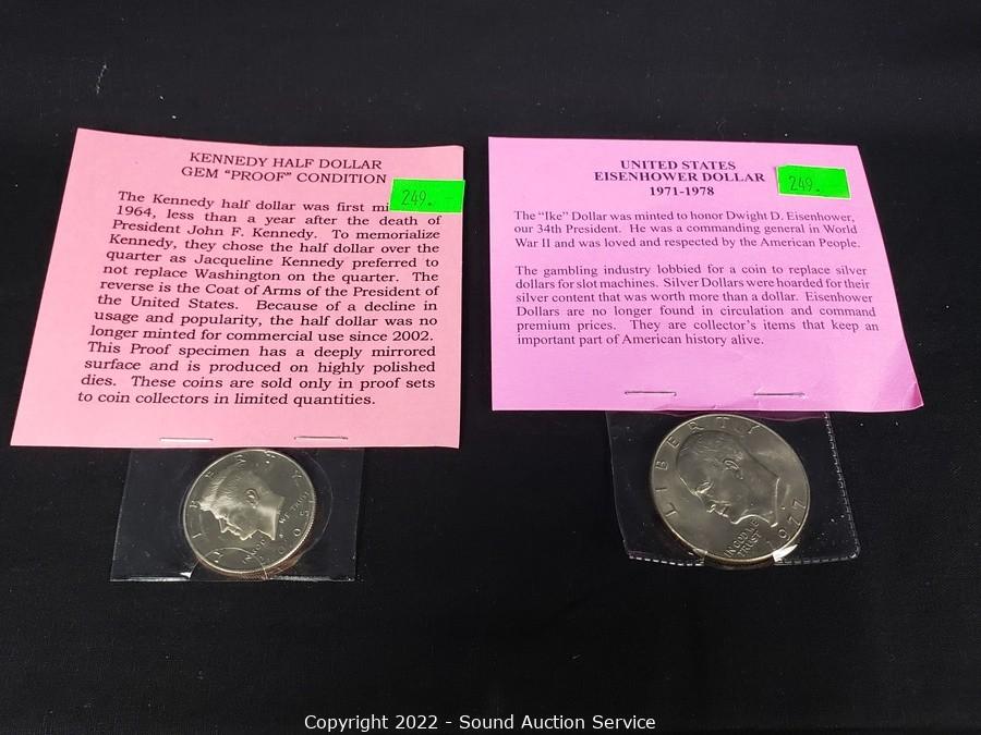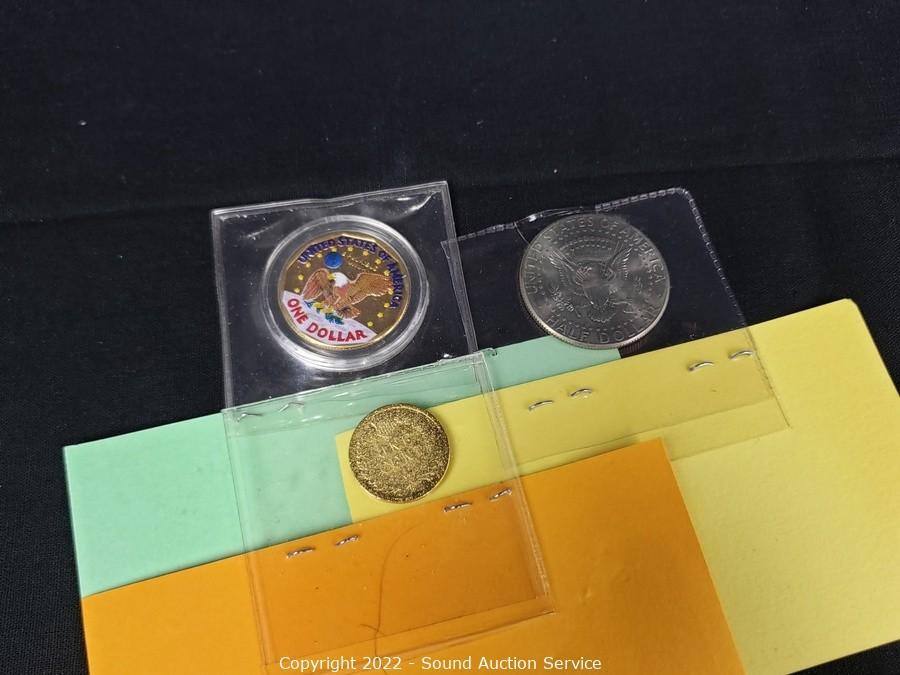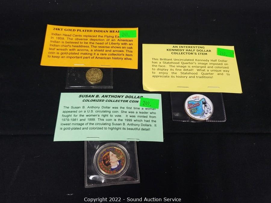 Lot Details: 24kt Gold Painted 1885? Indian Head Scent, 1999 Susan B. Anthony Colorized Dollar, 2002 Kennedy Half Dollar Painted in Ohio Statehood Image, 1977 Ike Dollar, 2005 Kennedy Gem Proof Half Dollar.