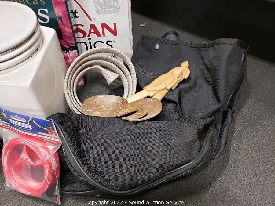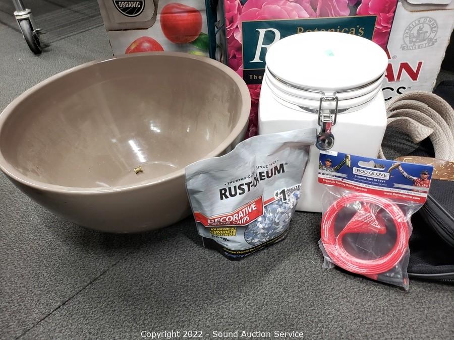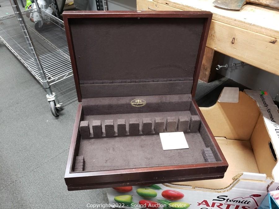 Lot Details: Kitchen canister, mixing bowl, Reed & Barton silverware chest, Wood salad utensils, Rod gloves, paint chips.