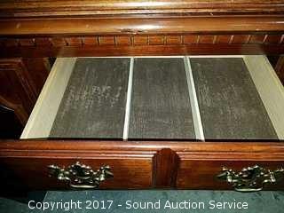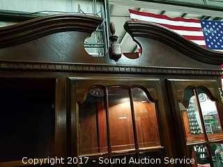 Missing a Knob on one of the lower cabinets, center flatware drawer lined with silver cloth. Nice Serpentine Molding with Finial. Approx. 82-1/2" tall, 56" wide 17" deep.