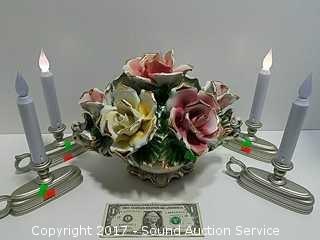 A couple of the leaves have chips. Comes with 4 Carlon battery operated candlesticks. Floral arrangement is 9" x 12".