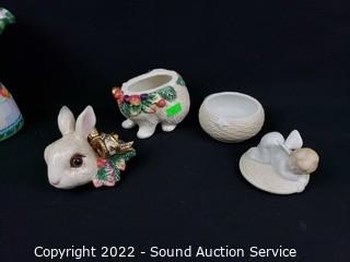 341 Lots including; Red Innovation Steel Frame Futon Sofa, Wrought Iron Matte Black Patio Table & Chair Set, Antique Mahogany & Marble 3-Drawer Vanity Dresser, Antique Oak Bowed Front Curio Cabinet, Nice Maple Hutch, Coleman Side by Side Utility Cabinets, Oak Wash Station Cabinet, Antique Oak Carved Accent Buffet, 18th Century Style Mahogany Sewing Cabinet, Assorted Drinkware Glasses, Fine Porcelain Figures, Fine China Dish Sets , Pottery, Knick Knacks, Figures, 19th Century Gustav Becker Pendulum Wall Clock, Griswold 10" Cast Iron Skillet, Artwork, Assorted Crystal & Clear Glassware, Bisque Hakata Dolls, Utility Shelves, Vtg. Macey White Wash Oak Lawyer's Bookcase, St. Francis Concrete Garden Statue, Lladro Figures & So Much More!!!