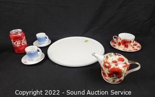 Lot Details: 2 Rosenthal espresso cup & saucer sets, 12" charger, 3pc Leonardo single teapot, cup & saucer set.