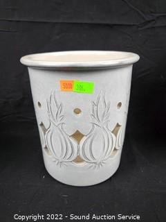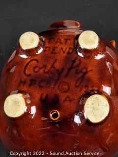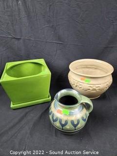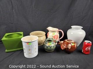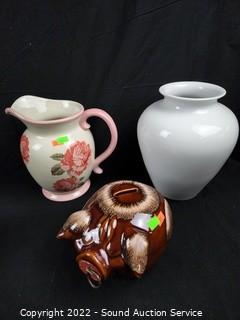 Lot #0306: Pottery Pitcher, Vase, Hurricane, Pots & Bank
