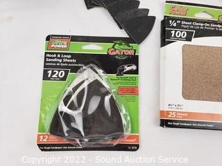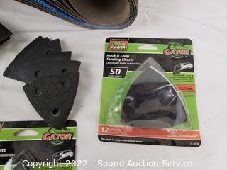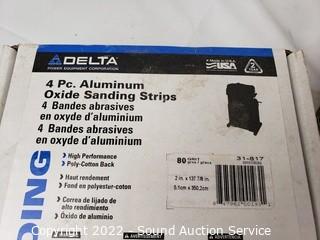 Lot Details: 4pc Delta Aluminum oxide sanding strips, Gator Hook & Loop sanding sheets, & 6" x 42" sanding belts.