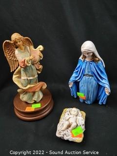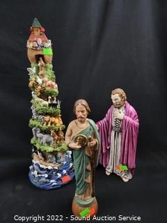 Lot Details: The 2 clear crystal are Waterford. Resin Noah's Ark Tree, Ceramic Joseph & Mother Mary, Baby Jesus, Resin angle & wise man. Not including Jesus 7" to 14.5" tall.