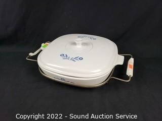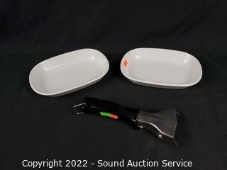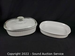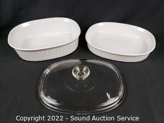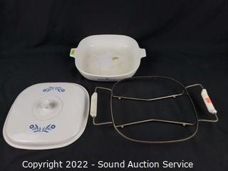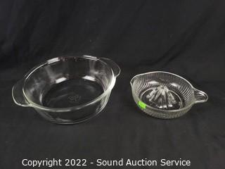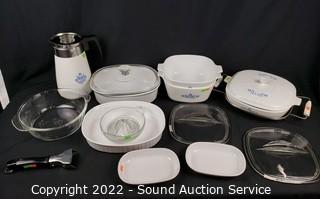 Lot Details: Coffee pot, various baking pans, dishes, handles, lids, juicer.
