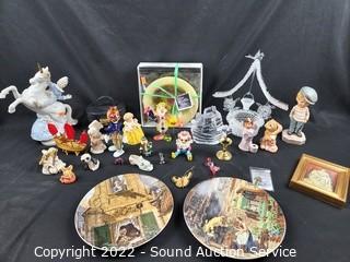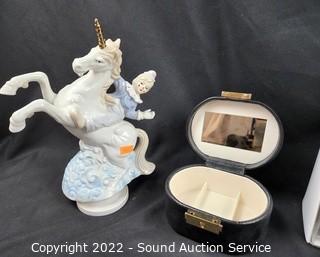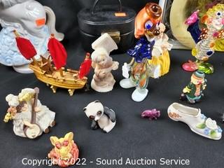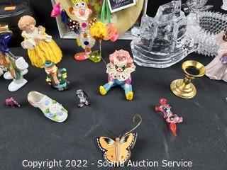 Lot Details: Art glass clowns, porcelain clown on unicorn, art glass floral basket sculpture, small jewelry box, wax decor, ceramic figure & more. Refer to photos for lot contents.