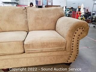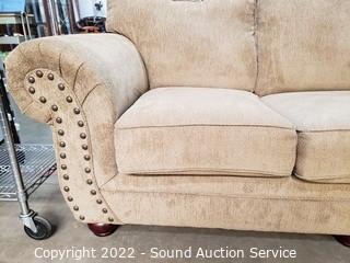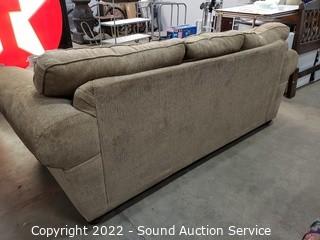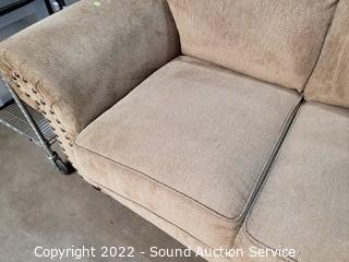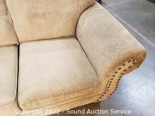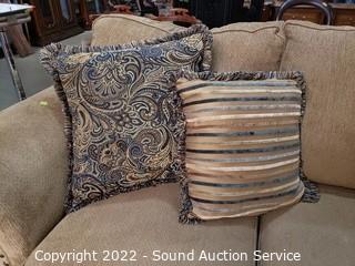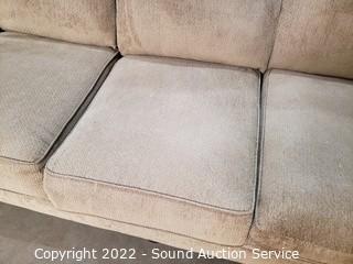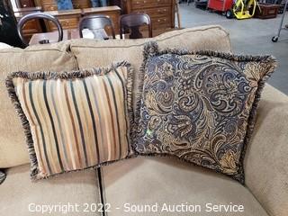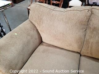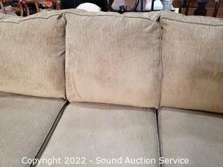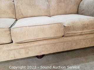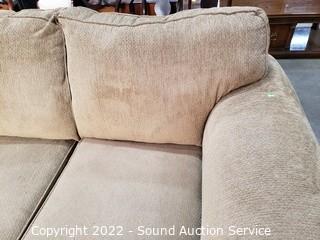Lot #0016: Beige Upholstered Sofa w/4 Throw Pillows