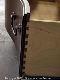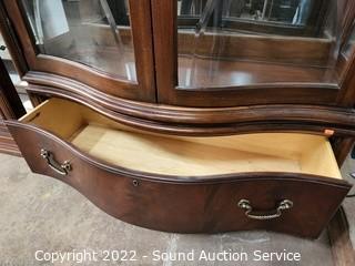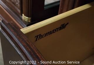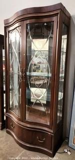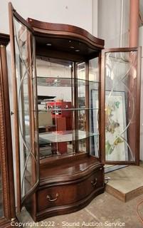 Lot Details: By Thomasville. Mirrored back, 3 glass shelves with plate grooves, Appears to be solid wood construction, dovetail joinery. Serpentine front, cut glass doors are also serpentine. Not sure how to turn it on, plugged in, don't see a switch anywhere to turn on lights. 89" H x 44" W x 20" D. Scuff on bottom front, otherwise in excellent condition.