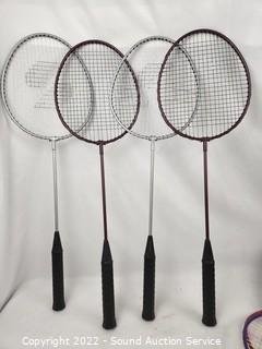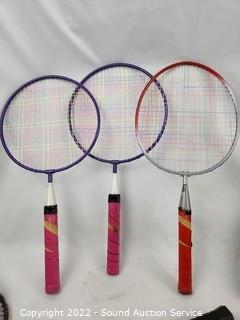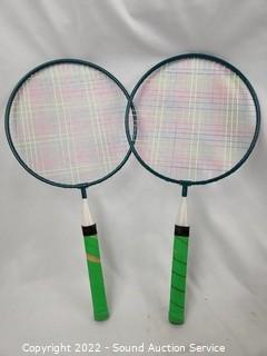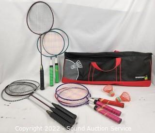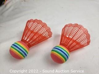 Lot Details: 9 Racquets, 2 shuttle cocks, 1 net. Missing cap at top of pole, otherwise complete.