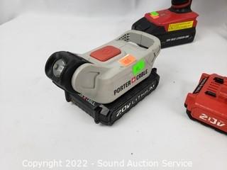 Lot Details: 2 hyper Tough Cordless drills, 2 batteries, 1 Porter Cable Impact & flashlight w/5 batteries & 1 charger. No chargers for the Hyper Tough batteries, 1 Hyper Tough Battery untested, everything else appears to be functioning as intended. Various wear from use.