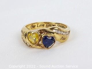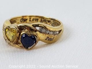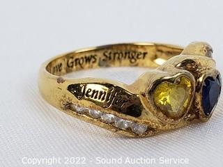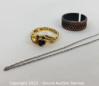 Lot Details: Also comes with a copper ring size 8. Bradford Exchange gold plated sterling silver ring size 6, set with sapphire, iolite and glass stones, 18" sterling silver chain necklace, has a missing/broken link, looks like it could easily be repaired. TW of sterling 4.7 grams.