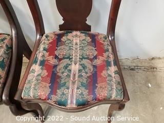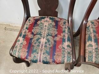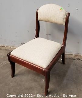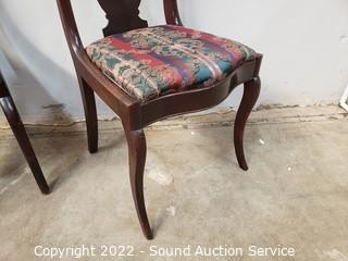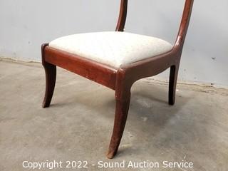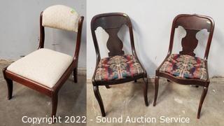 Lot Details: 2 Vtg. Recovered Mahogany Splat Back Chairs- Various wear to the finish. 32" H x 18" W x 17" to seat. Some pet hair present on upholstery. Vtg. Child's or Dressing Recovered Accent Chair - 26" H x 18" W x 12" to seat.