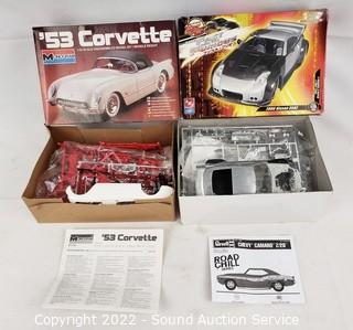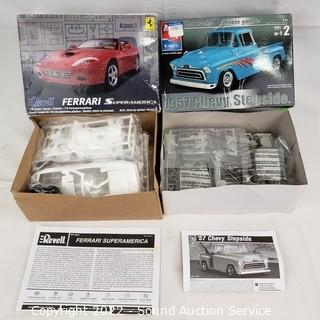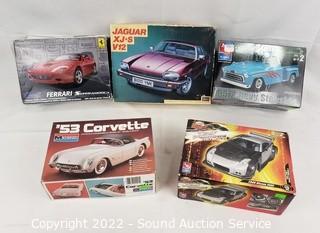 Lot Details: All but Jaguar & Nissan 350Z contents are sealed, otherwise unknown completeness. 350Z some parts are partially painted. Includes jaguar XJ-2 V12, 1957 Chevy Stepside, '53 Corvette, 2006 Nissan 350Z, Ferrari.
