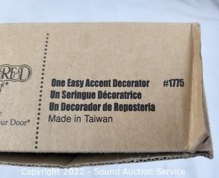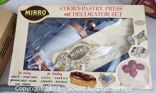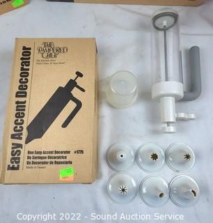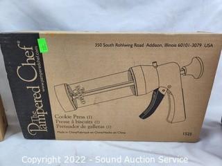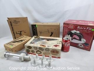 Lot Details: Pampered Chef Accent Decorator, Bake'n Fill 4pc Bake Set, Pampered Chef Apple Peeler/Corer/Slicer, Pampered Chef Cookie Press, Mirro Cookie Pastry Press. All in original packaging.