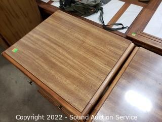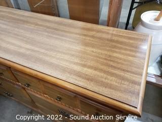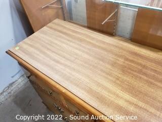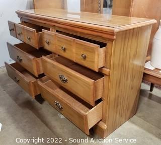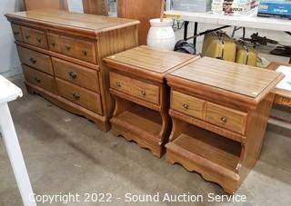 Lot Details: Wood front, laminate top. Some wear to finish, knicks, dings etc. Single drawer nightstands 24" H x 20" W x 16" D. 6-drawer dresser 31" H x 50" W x 17" D.