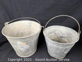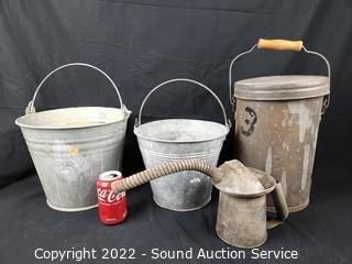 Lot #0129: 4pc Galvanized Pails, Oil Can