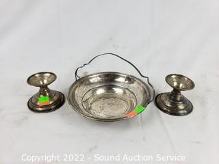 Lot #0099: Sterling Handled Bowl & 2 Candle Holders