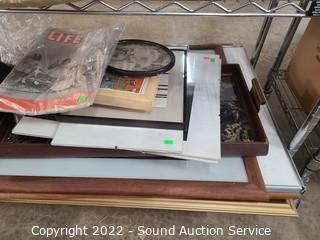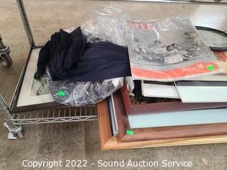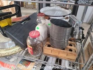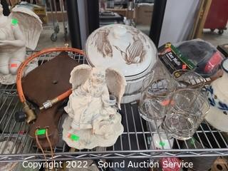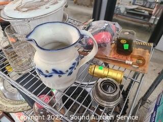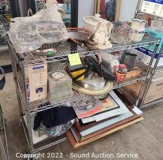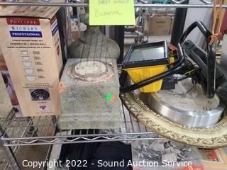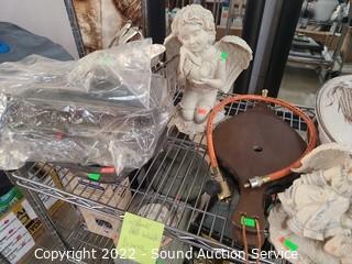 Lot Details: Concrete pedestal, silver plate, mirror, clock, enamelware, artwork, halogen light, ear protection, bellows & more. Cart NOT included.