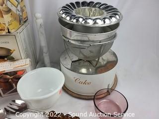 Lot Details: Marble paper towel holder, serving utensils, strainer, salt & pepper mill, cake tin, mold & more.