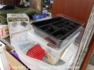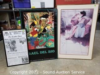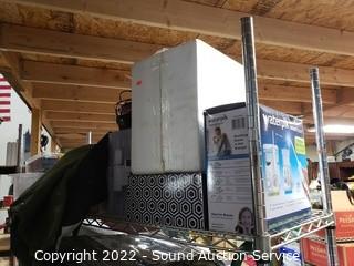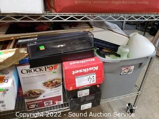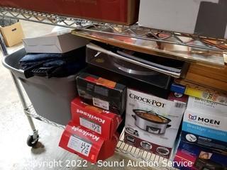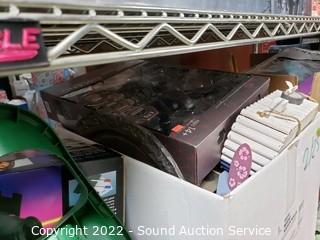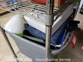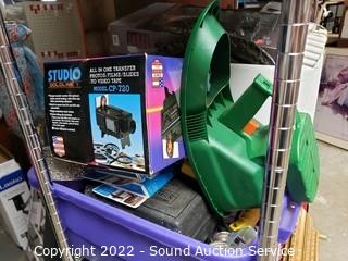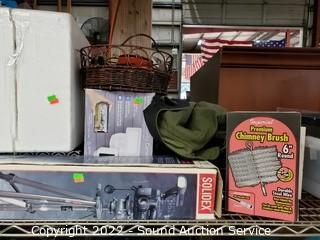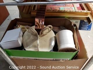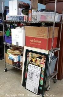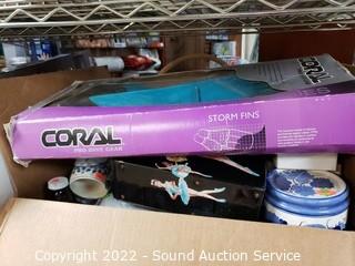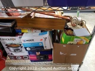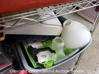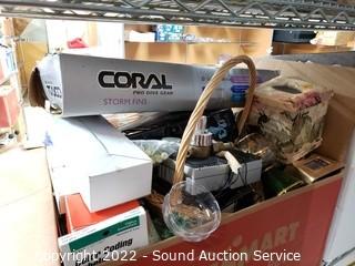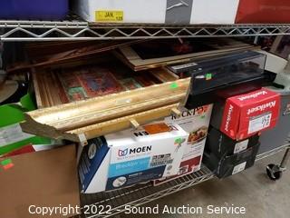 Lot Details: Various household, artwork, drone, seed spreader, tripod, floodlight, flippers, china & more. Refer to photos for lot contents. Cart NOT included.
