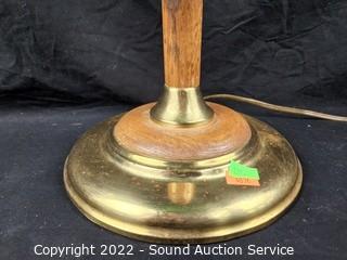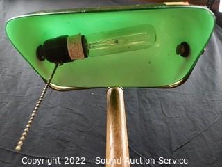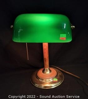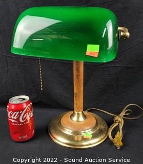 Lot Details: Wood, brass & green glass shade. 13" x 10". Works, some wear to the finish.