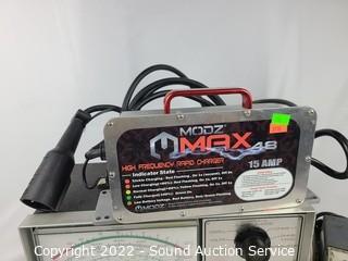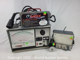 Lot Details: Amprobe, RCA Senior VoltOhmyst WV-98B unit has power, missing 2 knobs, untested. Sears Penske Automotive Analyzer Model 161.21042. Untested, put batteries into unit and was able to move the needle on some settings. Modz MAX 48 15Amp High Frequency Rapid Charger, unit has power.