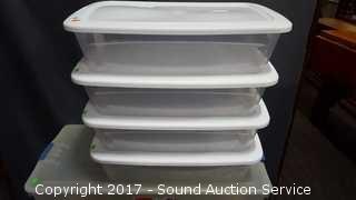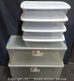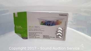 4 of the totes are 28qt, 24" x 17" x 16". Other two are 34" x 16" x 12".