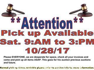 Hello Sound Auction Service Patron, we are very starved for space and desperately need all customers to review their invoices and pick up all items ASAP. Many items are not being picked up in the allotted pick up times and we are struggling for the space to create more auctions, so this really needs to stop! We appreciate your cooperation in this and your patronage.