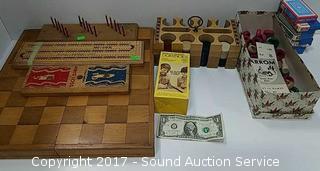 Over 300 Lots - Shop Tools, Craftsman Compound Miter Saw, Workmates, Sanders, Bench Vice, Wood Burner, Knives, Magnet Trays, Craftsman Table Saw, Antique Photo's, Newspapers, 1875 Vulgate Bible, 40" LED TV, Vintage Bedroom Sets, Waterfall Furniture, Gorgeous Buffet, Matching Dining Table, Stone Chess Set, Auto Tuner, Kenwood Receiver, JBL Speakers, Sterling Silverware and Salt & Pepper, Vintage German Walnut Mantle Clocks, Vintage Household Items, ERTL Diecast Banks, Disney Records, Marx Train Set, Spotting Scope & So Much More!!!