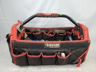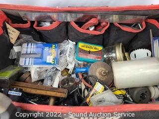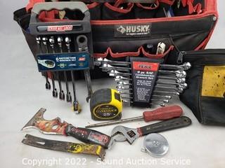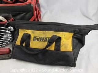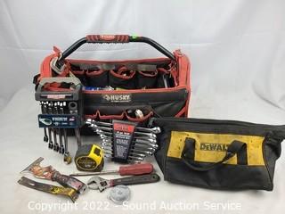 Lot Details: Wrench sets, hardware, hole saw bits, tape measures & more. 7" x 12" x 8" & 11" x 19" x 10" tool bags.