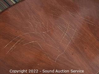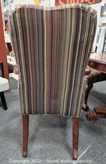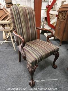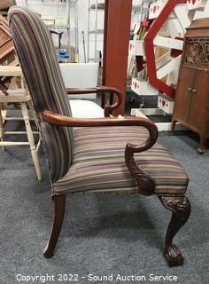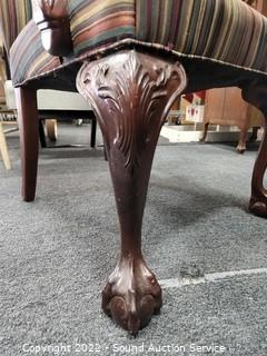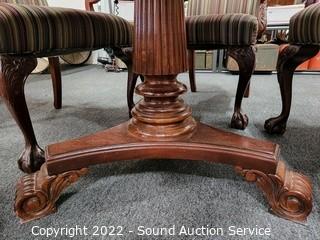 Lot Details: Table has various scratches on the top, 29" H x 38" Dia. 4 stripe upholstered, mahogany ball & claw foot chairs. Some scuffs & scratches to the finish.