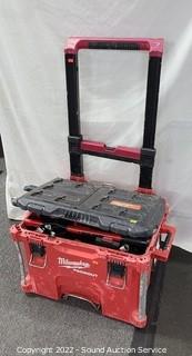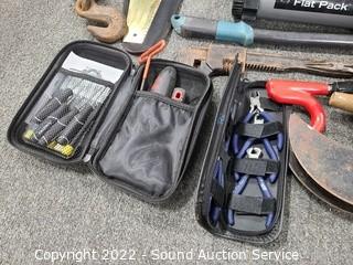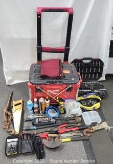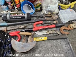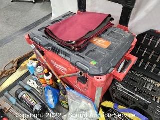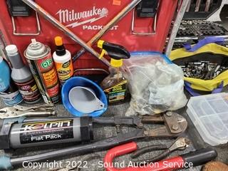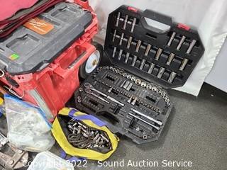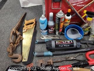 Lot Details: Chain binder, bolt cutters, socket set, steering wheel lock, glass & chrome cleaner, power steering fluid & more. 16" H x 21" x 16". Various wear to the finish.