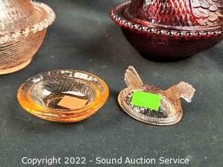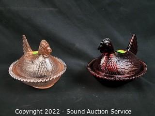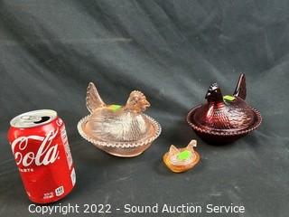 Lot #0067: 3 Pink & Ruby Hen-on-Nest Dishes