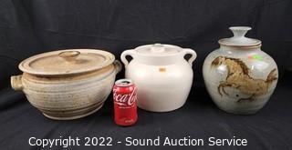 Lot #0206: 3pc Stoneware Pottery Pots w/Lids
