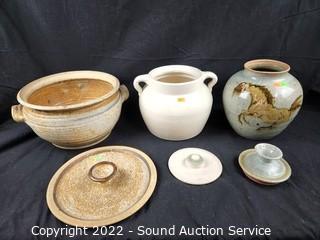 Lot Details: 2 are signed art pottery, other embossed with a 4. 7.5" to 10" H x 8" to 11" dia. Some crazing, no other issues.
