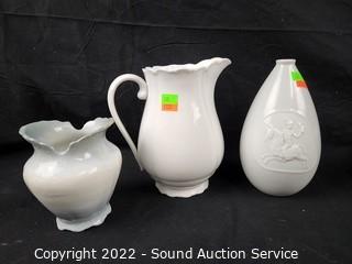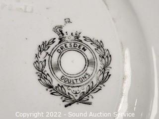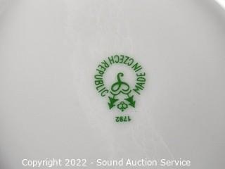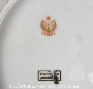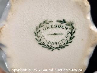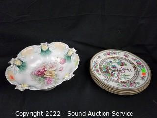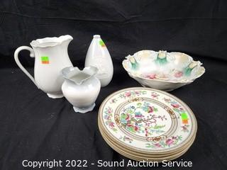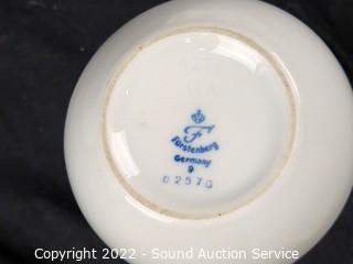 Lot Details: Small Dresden vase (has some damage on lip), Prussia 10" bowl, 5 hand painted Dresden 8" plates, Czech republic pitcher & Furstenberg Germany stem vase.